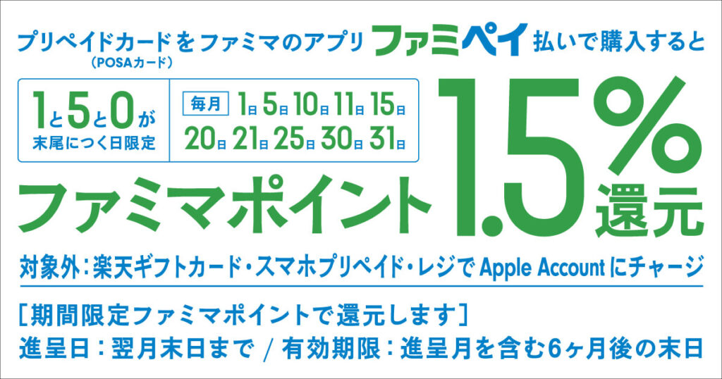プリペイドカードを購入する際は「1」「5」「0」が末尾につく日限定でファミマポイントが+1.5%還元されます。200円につき4ポイント相当還元ですね。